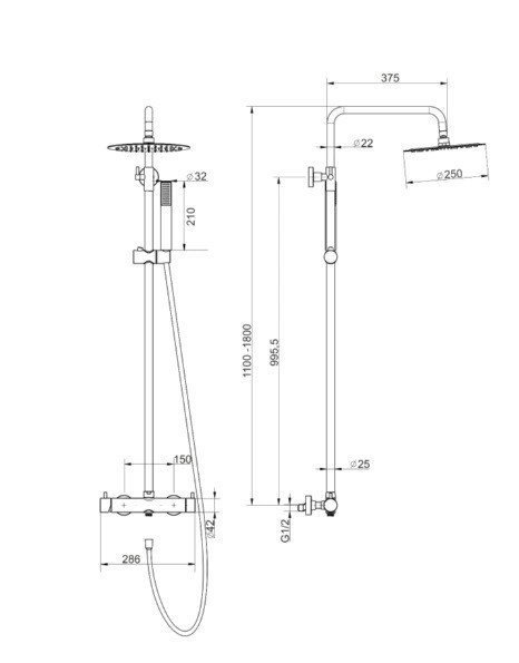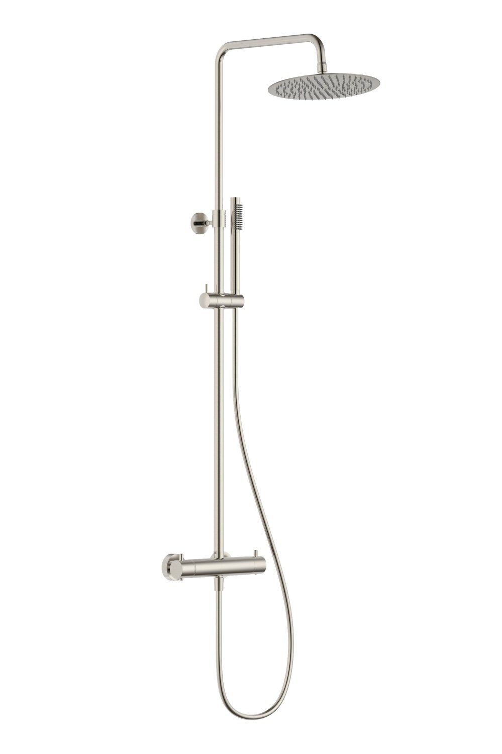 Душевая система с термостатическим смесителем (никель брашированный). Состоит из: верхний душ, ручной душ, смеситель-термостат для душа, штанга для душа, держатель для душа. Верхний душ Ø 250 мм.